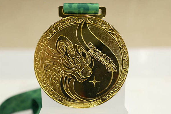 本次活动揭晓了赛事奖牌设计。奖牌正面主体为赛事会徽,巧妙融合太极阴阳图案与巴西元素。左侧轮廓展现巴西森林中的濒危物种虎猫,寓意人与自然和谐共生;右侧火焰符号象征武术运动的激情;中心星辰代表现代化赛事举办地巴西利亚。背面为国际武联会徽,绿色绶带融入巴西雨林生机与国旗元素。