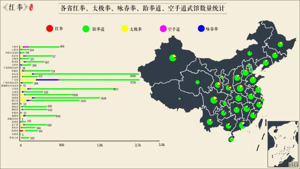 另据高德数据显示,截至2020年,以太极拳、咏春拳、红拳为代表的传统武馆在中国开设的数量为3283家,其中太极拳2259家,主要以广东省、河南省、山东省、江苏省、浙江省为主;红拳75家,主要在陕西省;咏春拳949家,主要在广东省。与此形成对比的时,源起于日本的空手道在中国开设武馆621家,以上海市居多。源起于韩国的跆拳道在中国280个城市开设武馆17219家,上海市最高可达691家。由此可见国人对外来武术的追捧程度。