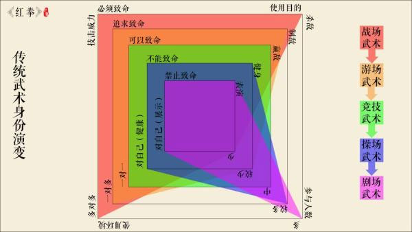 时至今日,传统武术的核心用法已经改变,不再是上阵杀敌、自卫的致命招数,更多的是强身健体或用来表演观赏。因此对于传统武术的传承需要立足历史、文化、技术等多个角度去挖掘中华传统武术的文化价值,保存传统武术精髓,让传统武术重新复兴,避免盲目 “创新”。
