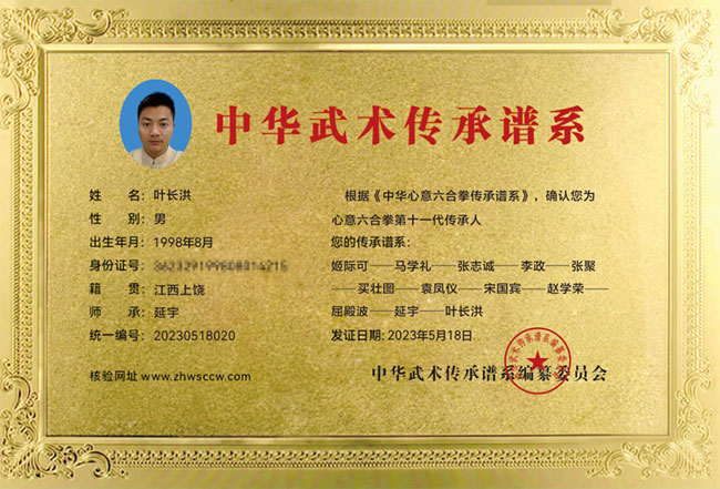 叶长洪,1998年生,江西上饶人,师承延宇——心意六合拳第十一代传人,武术协会理事成员,荣获优秀教练员荣誉称号。