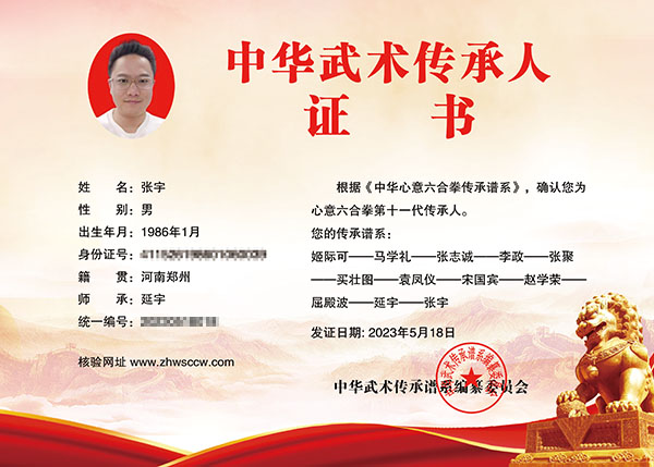 张宇,1986年生,河南郑州人,师承延宇——心意六合拳第十一代传人,武术协会理事成员,荣获优秀教练员荣誉称号
